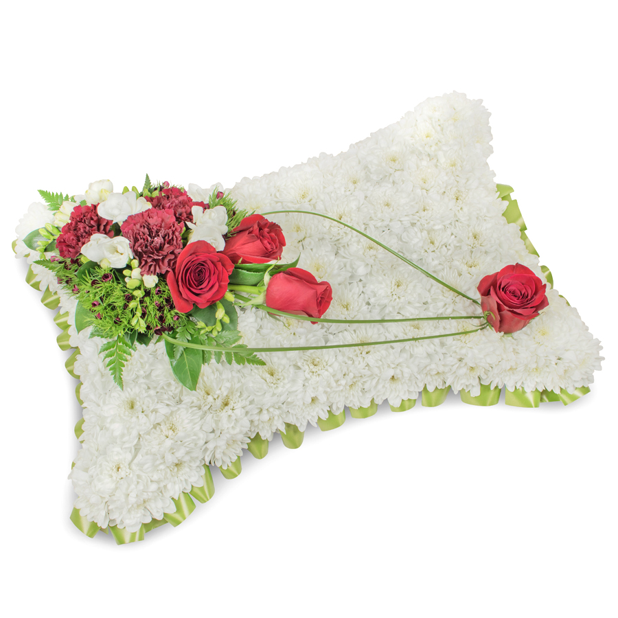 Deliver your deepest sympathies with our beautifully unique bouquet, designed to provide comfort and express your heartfelt emotions. This elegant arrangement combines white chrysanthemums, radiant red roses, sweet-smelling white freesias, rich dark red carnations, lovely dianthus, and swaying bear grass, creating a harmonious blend of colors and textures.